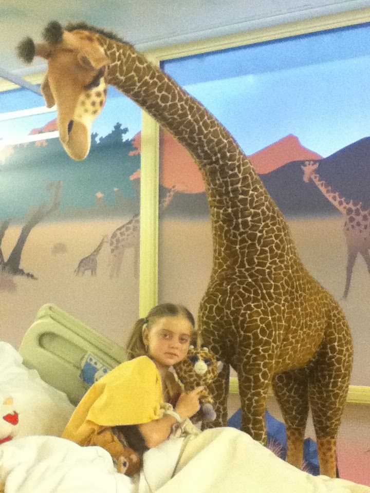 Het is al snel bijna 11 uur. Ik zal Guusje ophalen bij school. Dan kunnen Yvonne en Marleen nog even babbelen. Als ik met onze dochter terugkom in haar kamer, staat de verpleegkundige in de deuropening. We mogen naar beneden. Het is tijd voor OK. Ik probeer Yvonne te bellen, maar loop tegen een van de grootste beperkingen aan van het AMC. De verbinding voor mobiel bellen is erg zwak in deze betonnen vesting. Twee pogingen zijn nodig om Yvonne te pakken te krijgen. Ze snelt meteen naar boven. Iets na elven gaan we naar de verkoever. Daar moeten we wachten op de werkelijke operatie. Het wachten duurt lang. Lichtpuntjes zijn de aanwezigheid van een fijne verpleegkundige en Guusje’s favoriete dieren: giraffen.